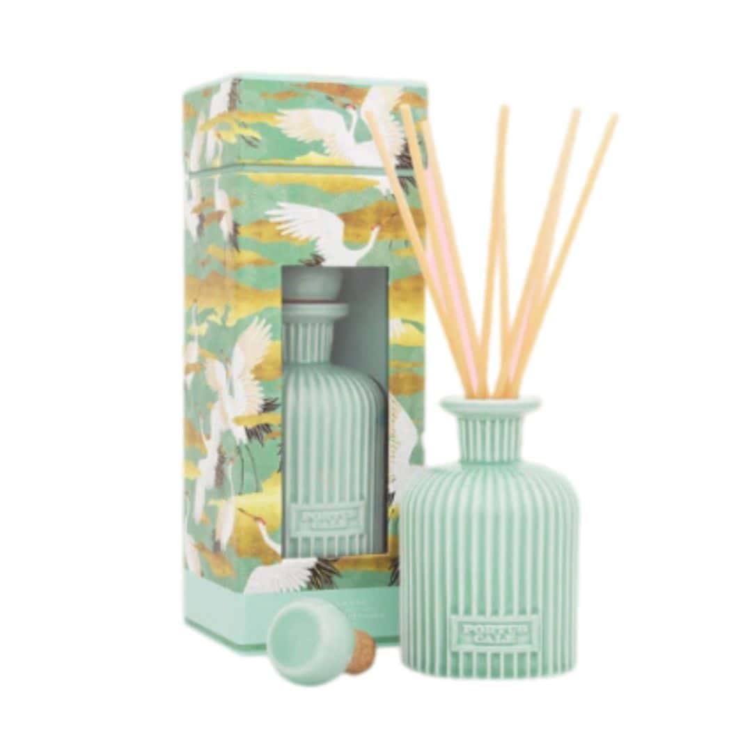מפיץ ריח קרמיקה Portus Cale White Crane 2L בצבע ירוק בהיר עם פסים לבנים אנכיים, המכיל מקלות קנה בצבע טבעי. - vavaVoom.co.il